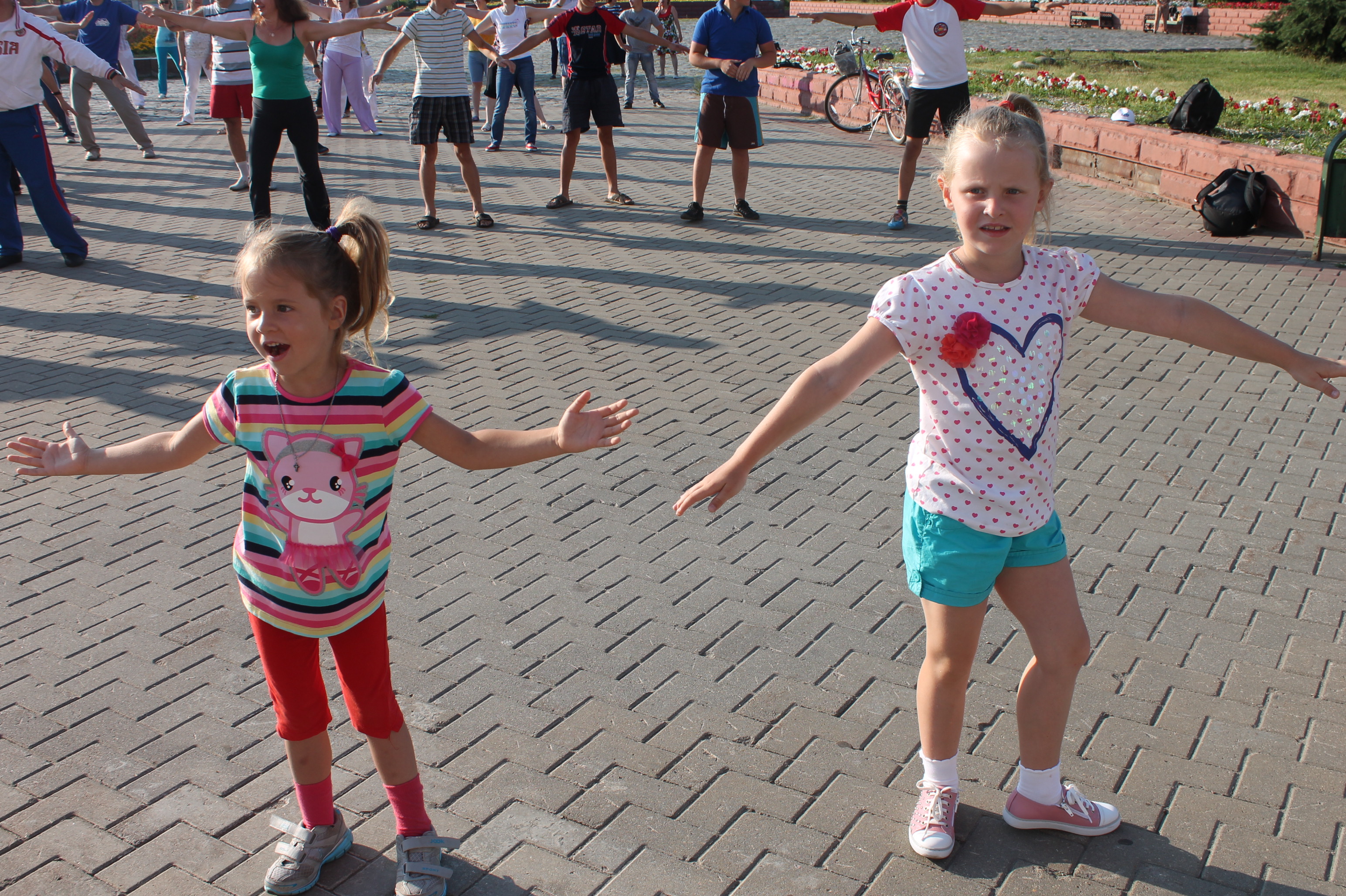 На Октябрьскую площадь вышли несколько сотен человек в спортивных костюмах: сотрудники администрации вместе с главой Олегом Апариным, специалисты ДС «Восток», участники военно-патриотических и спортивных организаций, юные спортсмены. Зарядка получилась наподобие праздника радости и здоровья, в котором приняли участие даже целые семьи. Под музыку, с огоньком, в течение двадцати минут, взрослые и дети выполняли комплекс несложных, но полезных упражнений, напомнивших «обязательную производственную гимнастику» советской эпохи.