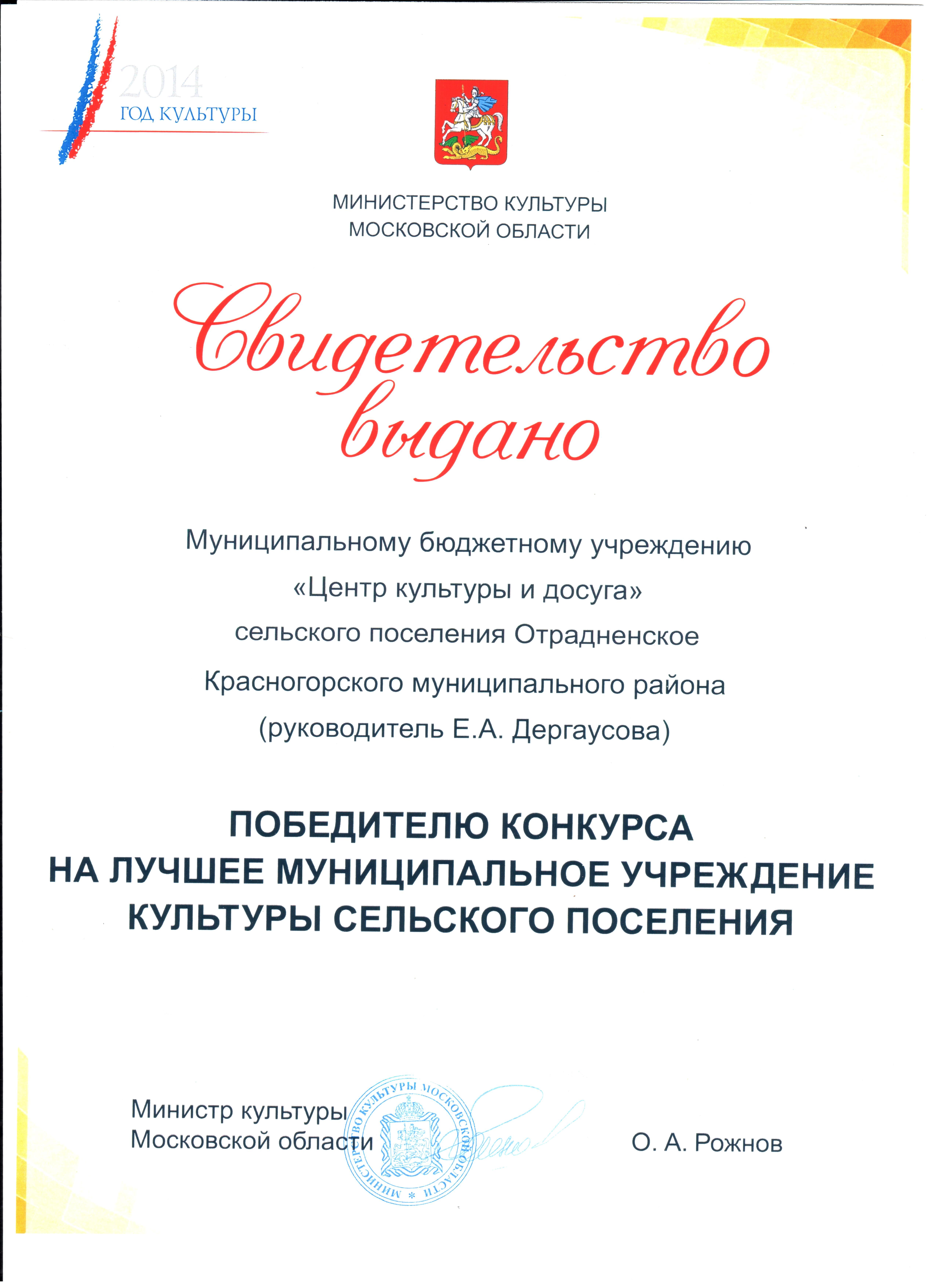 Центр культуры и досуга сельского поселения Отрадненское (Красногорский р-н) стал победителем областного конкурса на лучшее муниципальное учреждение сферы культуры, находящееся на территориях сельских поселений, и их работников, организованном Министерством культуры Московской области.