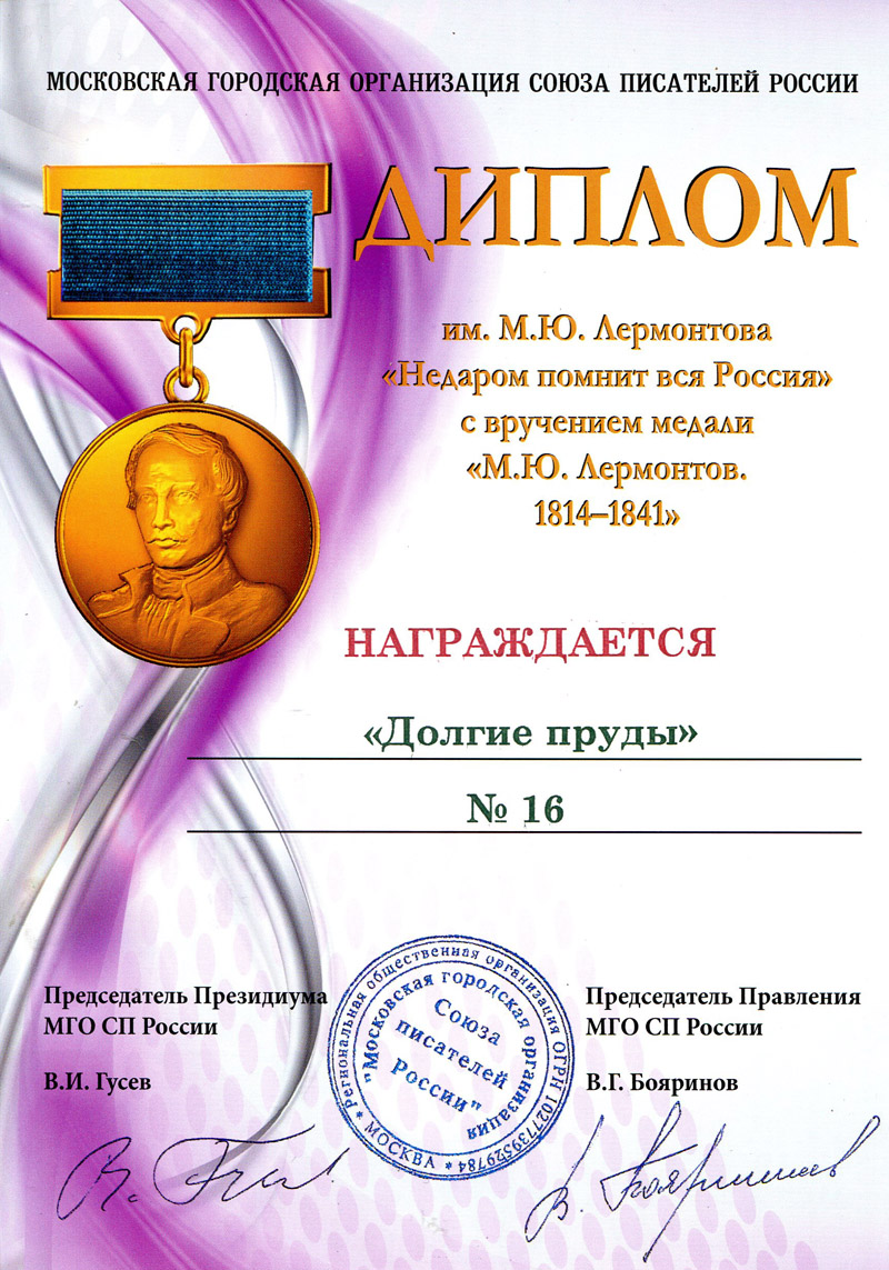 Торжественное вручение Диплома им. М.Ю.Лермонтова и памятной медали состоялось 14 апреля в помещении МГО СП РФ. Из рук Председателя Правления Владимира Гусева и члена Правления МГО СП РФ Дмитрия Силкана награды получила главный редактор альманаха Людмила Кузьмина. Этот новый номер литературно-художественного альманаха «Долгие пруды» увидел свет в конце 2013 года. Его с полным правом назвали юбилейным, так как первый альманах был напечатан в 1993 году, когда творческий коллектив городских литераторов ЛИТО «Клязьма» получил официальный статус городского литературного объединения.
