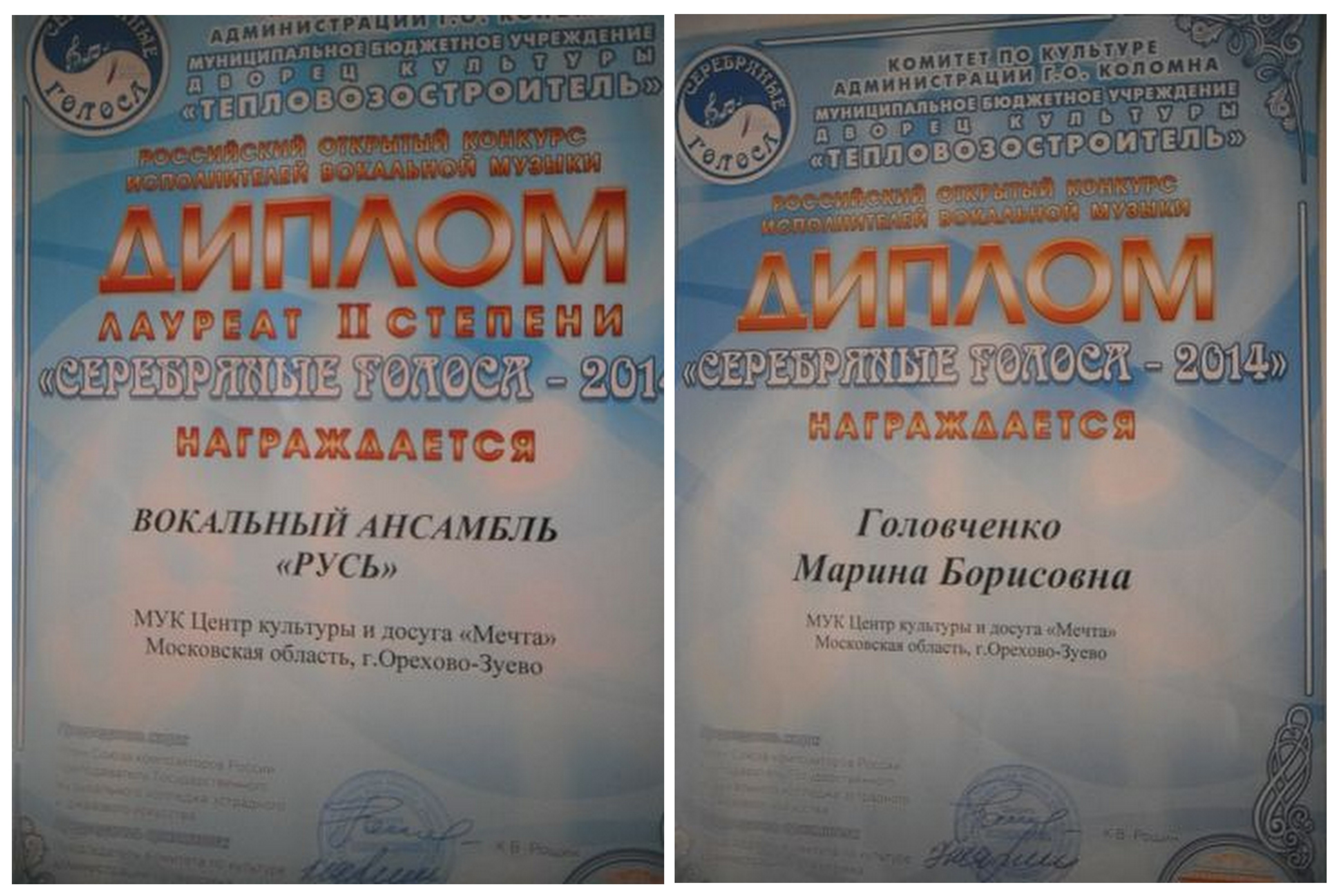 В престижном конкурсе успешно показали себя и наши земляки – артисты МУК ЦКД «Мечта» (г. Орехово-Зуево). Они стали победителями в своих номинациях – эстрадный и народный вокал. Илья Чадаев (руководитель – Лариса Матюшкина) удостоен Диплома лауреата I степени. Вокальный ансамбль «Русь» (руководитель – Марина Головченко) награжден Дипломом лауреата II степени. Победители награждены памятными подарками.
