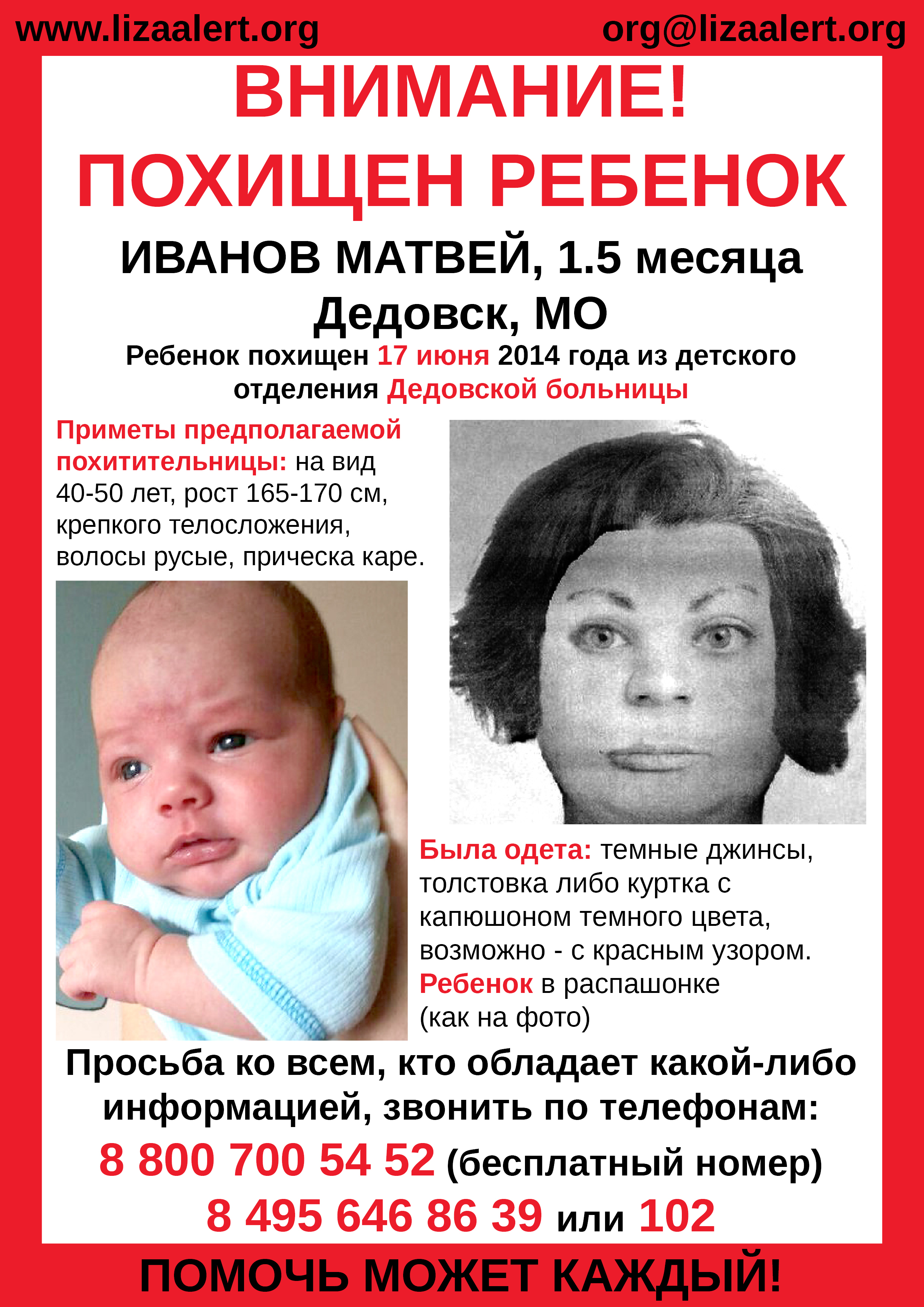 17 июня из подмосковного Дедовска был похищен полуторамесячный мальчик Матвей Иванов. Его вынесла из больницы неизвестная женщина. К поиску быстро подключилась полиция, а в Дедовске развернулся штаб добровольцев. Активное участие в поиске малыша принимают добровольцы поисково-спасательного отряда «Лиза Алерт», по региону уже расклеены десятки тысяч ориентировок. Оповещение о пропавшем ребенке сейчас идет через весь наземный транспорт Московской области, а также заклеено 90% областных электричек, на станциях идет массовое оповещение граждан о похищенном Матвее.
