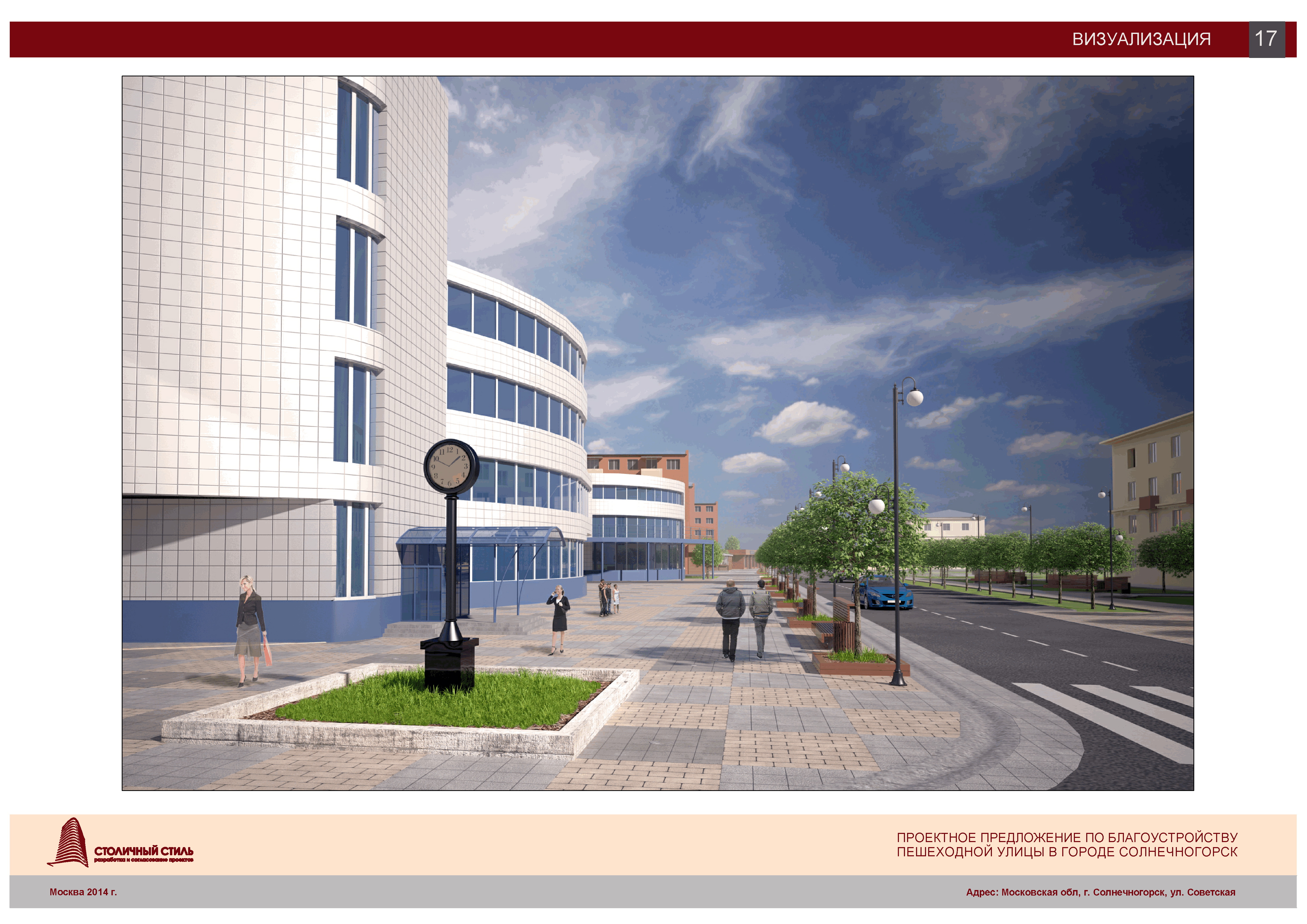 В соответствии с программой «Пешеходные улицы Подмосковья» Управлением архитектуры и градостроительства разработана концепция пешеходной зоны в г. Солнечногорске. Размещение пешеходной улицы планируется в центральной части города - в границах ул. Красная, Советская, Крестьянская и Почтовая. Протяженность проектируемой улицы - 200 метров.