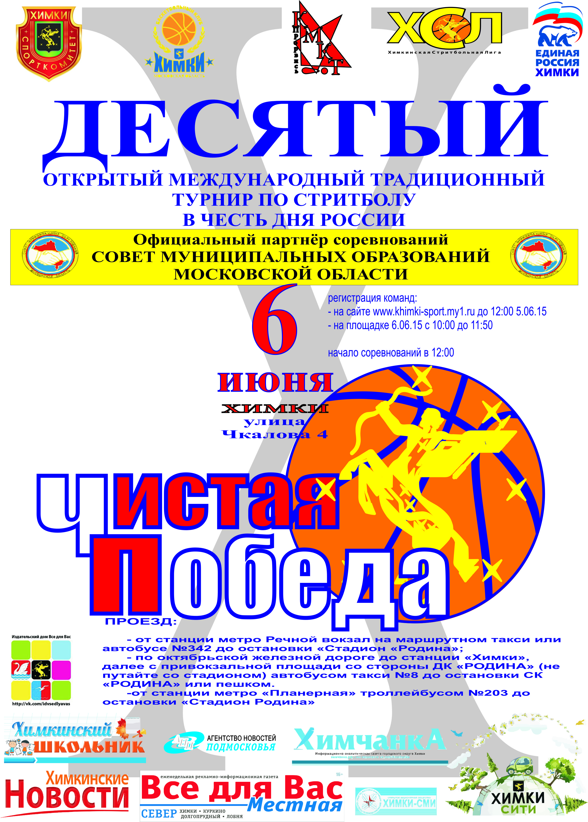 6 июня в Химках при поддержке Совета муниципальных образований Московской области пройдет Х открытый международный турнир по стритболу – уличному баскетболу – среди любительских команд «ЧИСТАЯ ПОБЕДА».